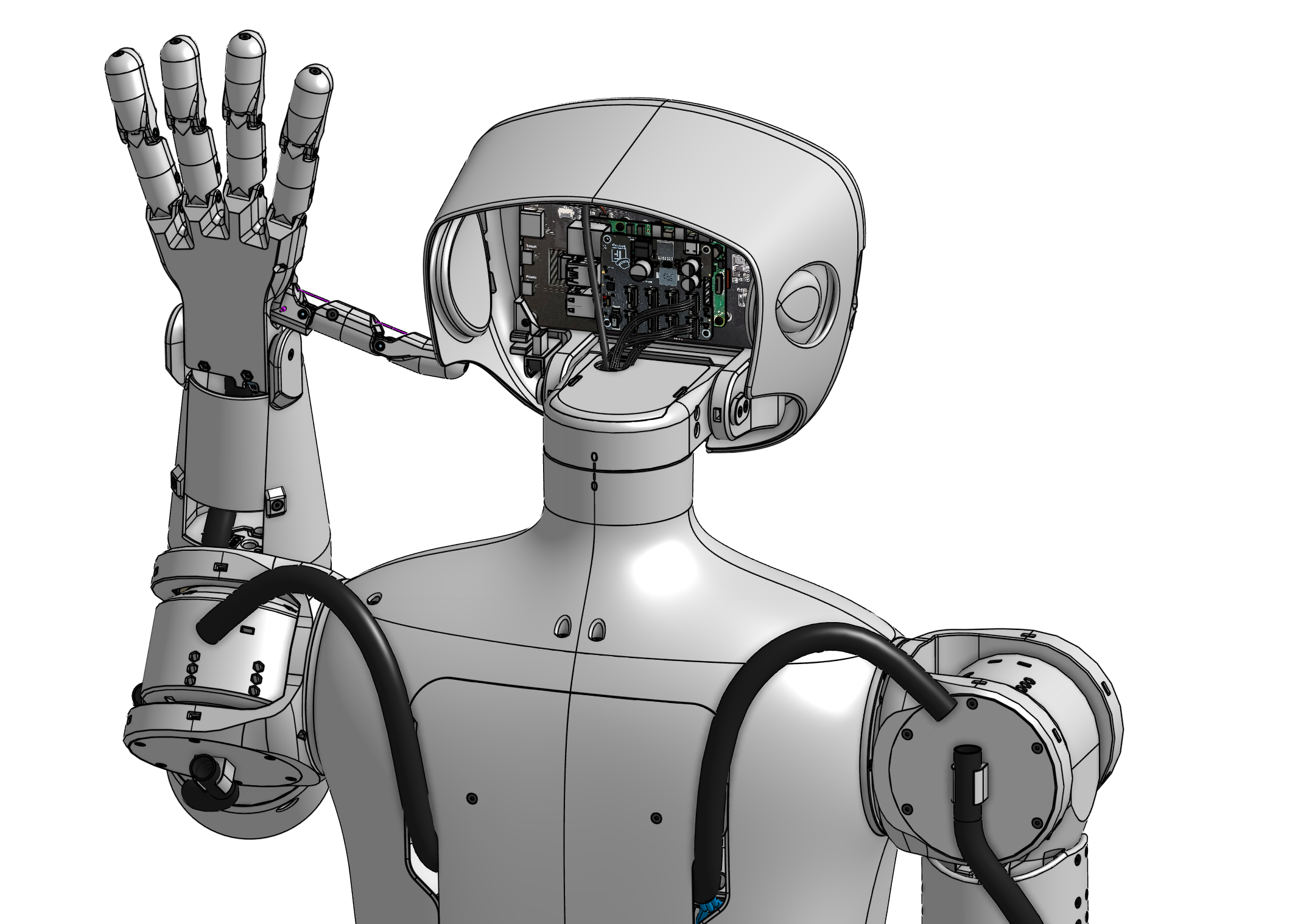 Neben dem Oberkörper lag mein Augenmerk auf der Optimierung des Halses sowie der Schultergelenke. Durch gezielte konstruktive Änderungen gelang es, die Kabel für den Hals und Kopf ins Innere des Roboters zu führen. Diese Neuerung erhöht nicht nur die Zugänglichkeit und das ästhetische Erscheinungsbild, sondern macht den pib-Roboter insgesamt sicherer und nutzerfreundlicher.