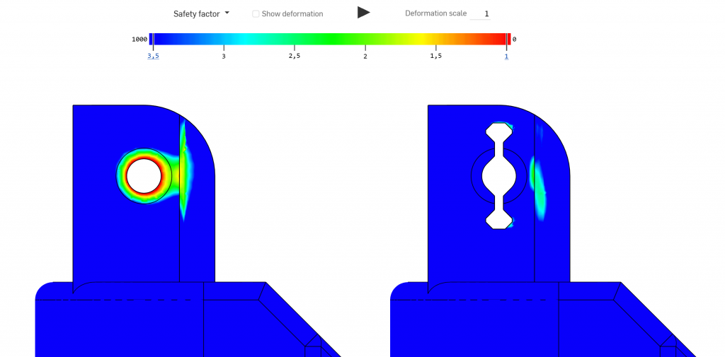 Mit den integrierten Simulationstools von Onshape entwarf ich flexible Pressverbindungen für die 2×20-Metallstangen. Diese Verbesserung erleichterte das Drucken kleiner Löcher zur Aufnahme der Stangen, ohne die 3D-gedruckten Teile während der Montage zu beschädigen.