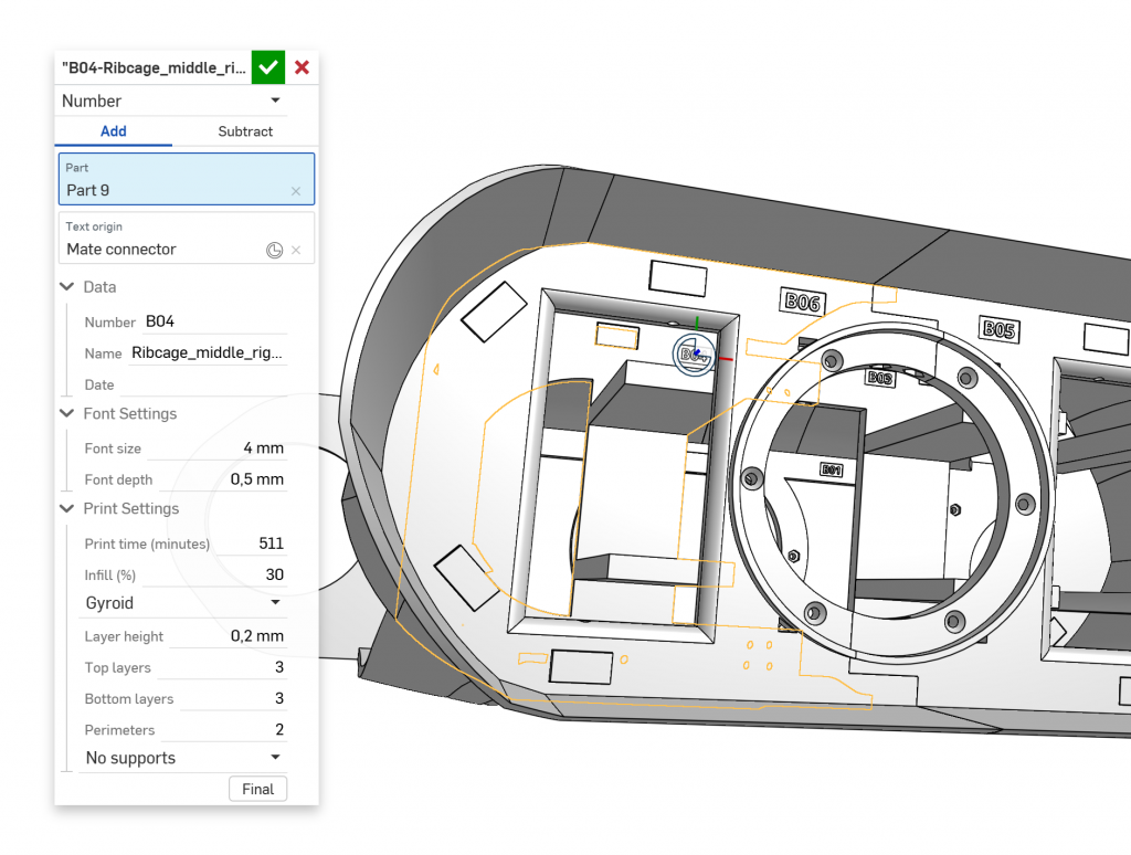 Ich entwickelte ein FeatureScript in Onshape, um die Teilenummer auf jedem Bauteil zu prägen. Dieses Skript erfasst auch andere Daten, wie Druckeinstellungen, die dann in den Metadaten jedes Teils gespeichert werden.